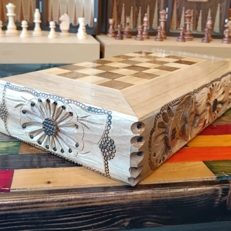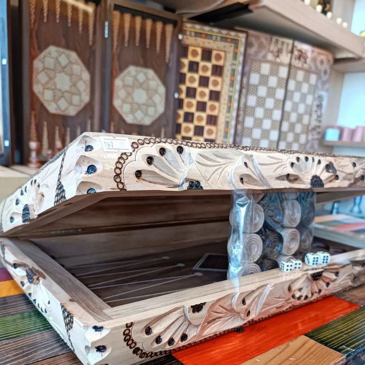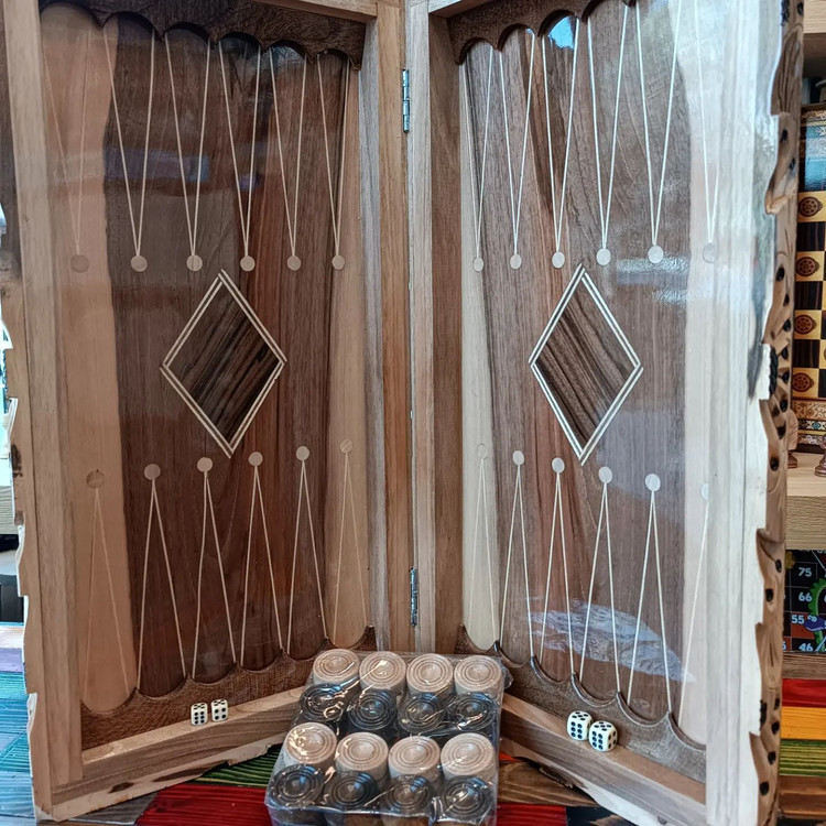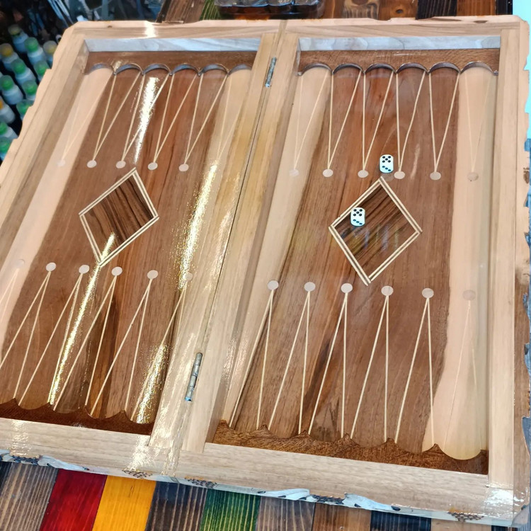 تخته نرد گردو دور منبت سنندج طرح گل . . زمینه داخل و پشت معرق تیکه های چوب رنگ لاک و الکل + پای استر ضد خش و رطوبت دور منبت طرح گل کاور حمل و نقل ترمه سنتی مهره تخته نرد چوب گلابی یک جفت تاس مالزی یک جفت تاس سندلوس آلمانی . . . بلوار پیروزی _ بین پیروزی 36 صنایع دستی ترنج . . .